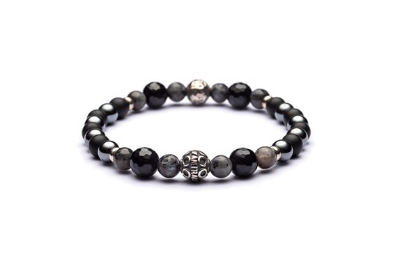 Bracciale in argento 925/°°° con labradorite grigia, agata nera ed ematite. Le pietre, del diametro di mm.6 e mm.8, si susseguono creando un perfetto ordine cromatico, reso originale unicamente dalle sfumature naturali della pietra. Tutti i gioielli della linea Classic sono identificati dalla sfera Antracite in argento 925/°°°. Gli elementi vengono infilati in un filo elastico in silicone molto resistente. Creazione artigianale, interamente realizzata a mano, 100% Made in Italy.