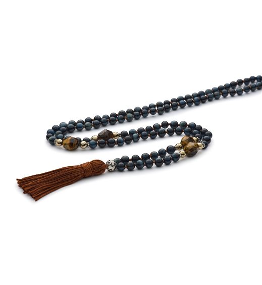 Mala tibetano in pietre dure naturali: occhio di tigre blu e marrone, pirite, nappa di cotone marrone, sfera Antracite in argento 925/°°° invecchiato (effetto creato interamente a mano). Dimensione pietre: 108 sfere da mm.6 e 4 pietre da mm.8. Mala in sanscrito significa “ghirlanda”. Questo strumento sacro monta 108 sfere di pietre dure naturali, che vengono infilate ed annodate una ad una. Le sfere rappresentano l’unione e la connessione esistenti alla base di tutti gli esseri viventi. In ogni Mala c’è un grano più grande, detto Guru, unito ad una nappa di cotone che rappresenta il loto dai mille petali. Creazione artigianale, interamente realizzata a mano, 100% Made in Italy.