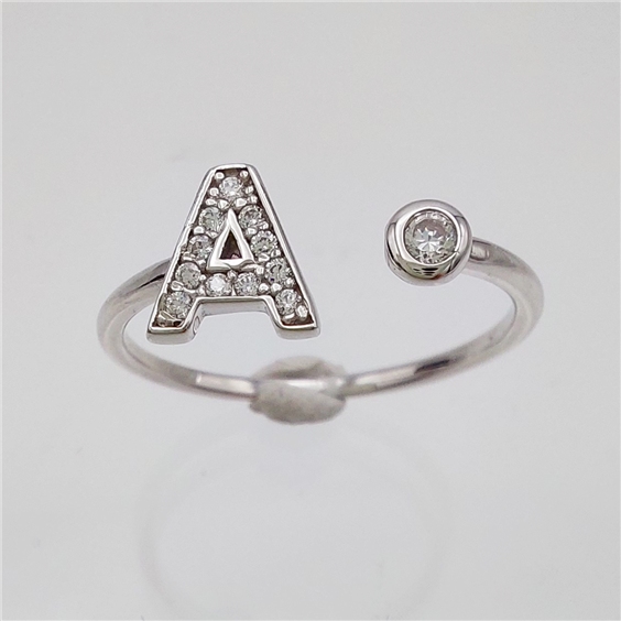 Anello in oro bianco 750‰ con lettera A e zirconia. Il gambo aperto sopra ne permette la messa a misura.