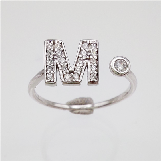 Anello in oro bianco 750‰ con lettera M e zirconia. Il gambo aperto sopra ne permette la messa a misura.