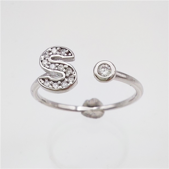Anello in oro bianco 750‰ con lettera S e zirconia. Il gambo aperto sopra ne permette la messa a misura.