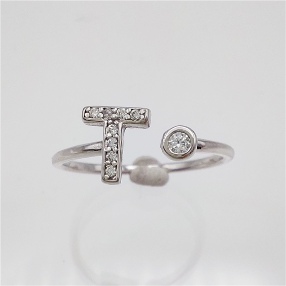 Anello in oro bianco 750‰ con lettera T e zirconia. Il gambo aperto sopra ne permette la messa a misura.