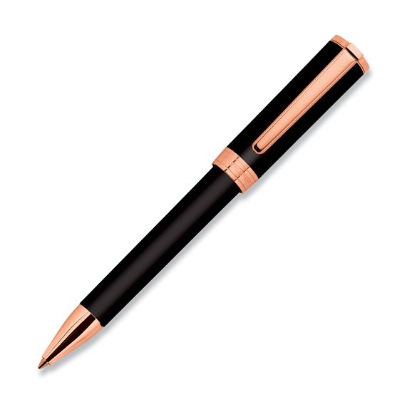 Penna a sfera con cappuccio e corpo in resina nera. Finiture in oro rosa.