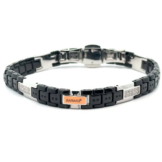 Bracciale in Oro rosa 750‰ e Ceramica nera Hi-Tech, impreziosito da Diamanti neri P.Ct 18. Chiusura in Acciaio inossidabile.