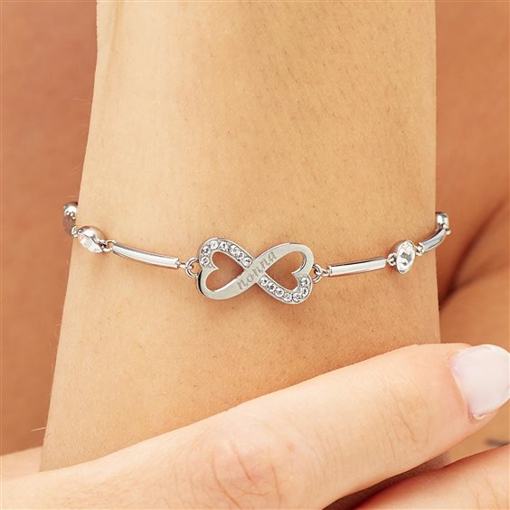 COMPLICITÀ, PAZIENZA, AMORE Non c’è complice migliore che una nonna che ti ama. Paziente e tollerante, dolce ed affettuosa, sei il mio più bel rifugio! Ti voglio bene nonna. Bracciale semirigido in acciaio 316L con centrale a forma di infinito con scritta "nonna" e cristalli.
