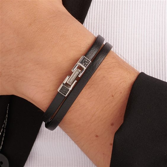 Bracciale doppio giro in pelle colore nero con elementi in acciaio 316L e finitura pvd colore rutenio con zirconi neri.