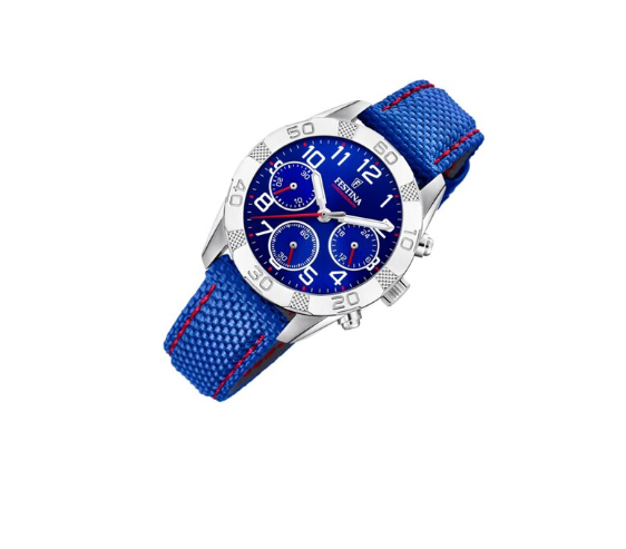 Orologio ragazzo , movimento cronografo al quarzo MJS20 , cassa in acciaio 316L , mm 36 , ghiera fissa , vetro minerale , quadrante blu con numeri e lancette bianchi , dettagli rossi , fondello a pressione , cinturino in pelle e tessuto blu con cuciture rosse