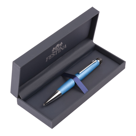 Penna a sfera Festina. Color azzurro e acciaio. Lunghezza cm 14, peso gr 40,3. Dettaglio "testa" come corona orologio. Inchiostro nero. Possibilità di piccola incisione. IN CASO DI INCISIONE NON SARA' POSSIBILE IL RESO