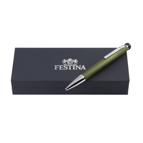 Penna a sfera Festina. Colore verde oliva e acciaio. Misura cm 14, peso gr 41,7. Inchiostro nero. Possibilità di piccola incisione. IN CASO DI INCISIONE NON SARA' POSSIBILE IL RESO.