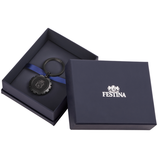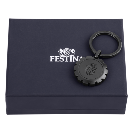 Portachiavi Festina in nero con l'emblema del marchio, dal design moderno e irriverente ispirato al design unico degli orologi della collezione Chrono Bike.