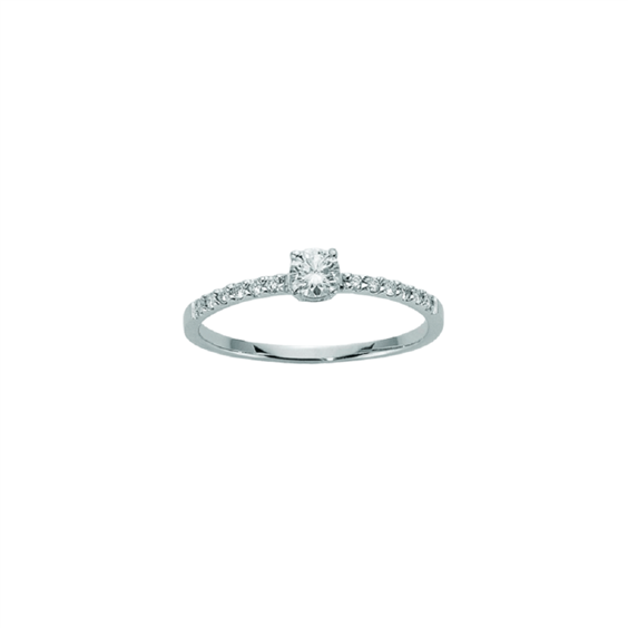 Anello Miluna in oro bianco 18 kt, ha un diamante taglio brillante centrale di 0,18 punti di carato colore G. Sul gambo ci sono 12 diamanti per un totale di 8,4 punti di carato. Tutti diamanti sono incastonati con 4 griffe.