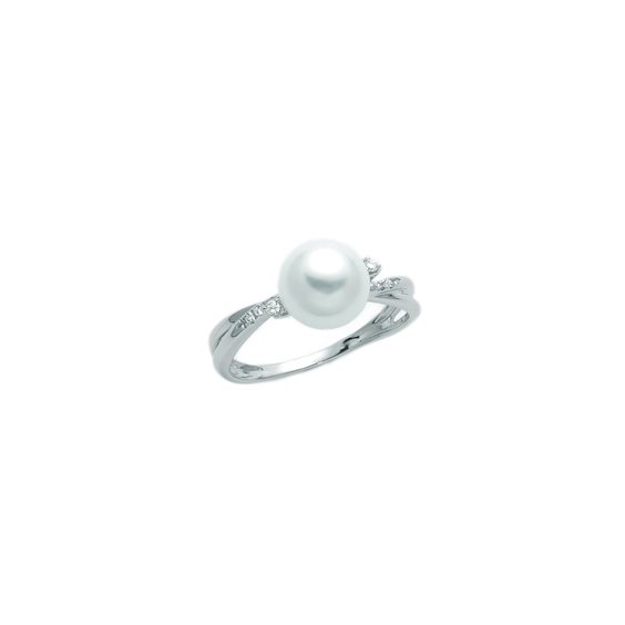 Anello con perla della collezione Miluna Parure Perle da donna. Colore: oro bianco e bianco. L'anello è in oro bianco 750‰ (18kt) composto da doppio gambo intrecciato con diamanti di caratura totale 0,0312 - colore G - purezza SI e da perla coltivata centrale di colore bianco e ø 8-8,5. 100% Made in Italy.