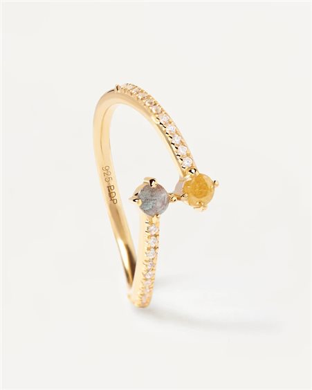 MATERIALE: Argento sterling 925 FINITURA: Placcatura in oro 18k PIETRE: Labradorite, iced zirconia gialla, zirconia bianca. DIAMETRO PIETRE: 3 mm / 1 mm PESO: 1.83 mm