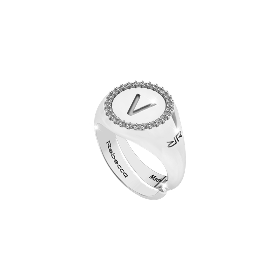 Anello Rebecca in argento 925‰ con zirconia bianca incastonati e lettera V. Misura 10 modificabile a piacere.