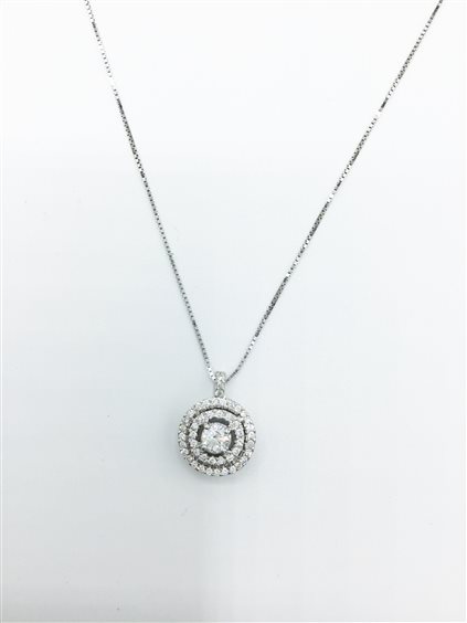 Collana Recarlo in oro bianco 750‰ con diamante centrale di 0.22 ct e due contorni di diamanti che abbracciano la pietra centrale dandole ancor più luminosità. Nel contorno interno sono presenti diamanti per un totale di 0.21 ct mentre in quello esterno per un totale di 0.43 ct. Nella catena di tipo veneziana di lunghezza 42 cm sono presenti 2 carellini a 2.5 Cm per dare la libertà di scegliere la lunghezza a cui indossare l'oggetto.