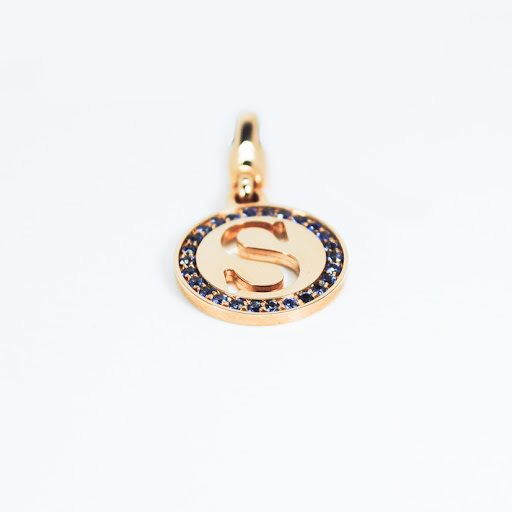 Raffinato ciondolo in oro rosa con lettera e contorno di zaffiri. Anello fatto a moschettone per poterlo agganciare a qualsiasi tipo di catena.