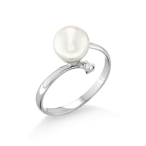 Anello in oro bianco 750‰ con 1 perla AAA di dimensione 7-7.5 mm e 1 diamante bianco qualità G-Si da 0.02 ct
