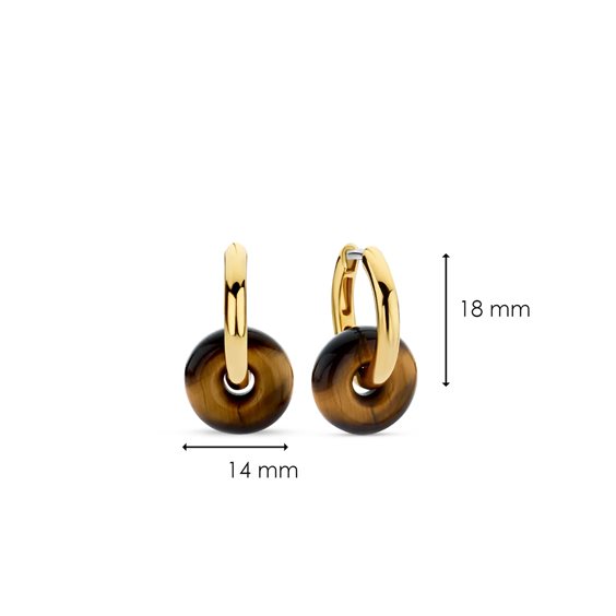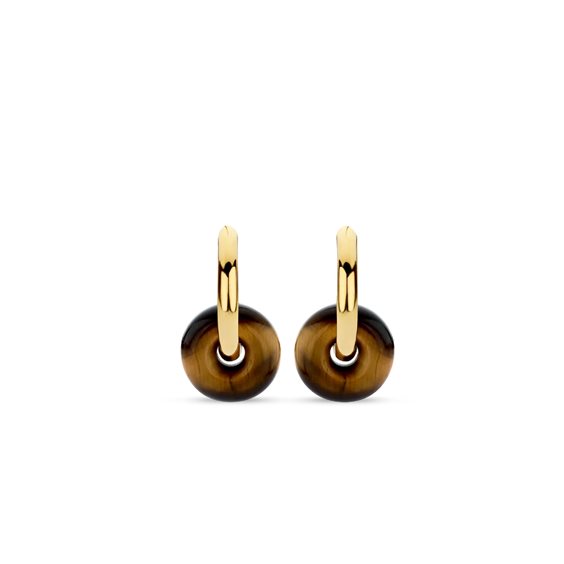 Questi orecchini d'argento placcato oro TI SENTO - Milano spiccano per le due grandi di pietre di occhio di tigre che pendono delicatamente dai cerchi placcati oro. L'originale forma a ciambellina della pietra fa di questi orecchini, realizzati in argento sterling 925‰, una piccola opera d'arte. I toni caldi di questi gioielli emanano equilibrio e grande energia. Abbinali ad altri orecchini per un look di grande personalità.