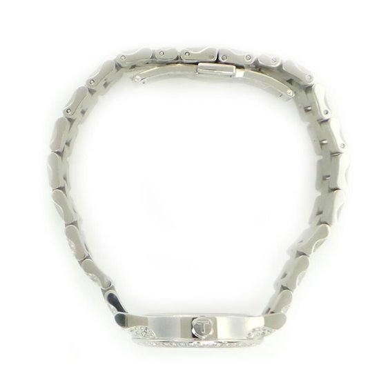 Orologio solo tempo, cassa e cinturino in acciaio con chiusura a farfalla e pulsanti, movimento svizzero al quarzo, vetro zaffiro, impermeabile 3 ATM, quadrante madreperla, diametro 27mm. Arricchito con 113 Diamanti Naturali ct. 0,37. Completamente Swiss Made