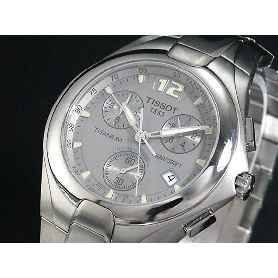 Orologio Tissot completamente in Titanio, movimento al quarzo swiss made, impermeabile a 100mt. vetro zaffiro antigraffio, Bracciale e cassa in Titanio e quadrante color grigio con indici luminosi e datario al 4. Scala tachimetrica. Chiusura di sicurezza con bottone a pressione.
