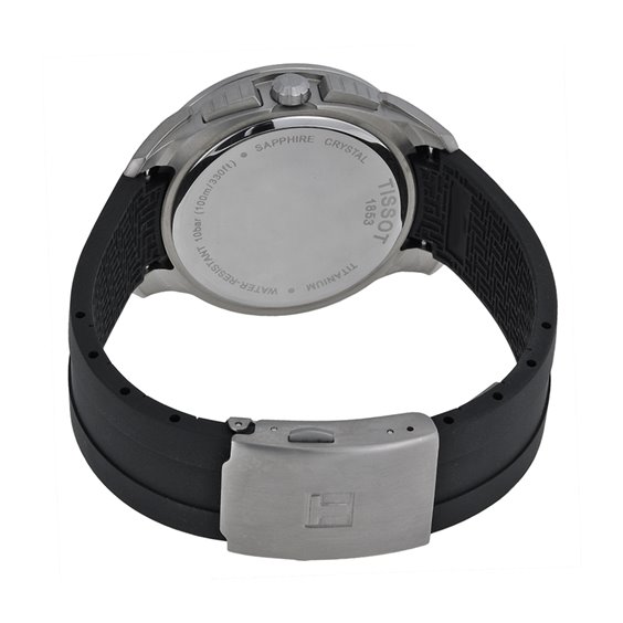Questo orologio Tissot ha una cassa in titanio con con un diametro di 43 mm ed è dotato di un cinturino in Gomma nera con chiusura a pulsanti. All'interno ha un movimento al quarzo con funzioni di Cronografo dotato di datario ed è finito con un vetro zaffiro antigraffio. L'orologio è impermeabile a 10ATM. Questo significa che l'orologio è adatto per nuoto e snorkeling. L'orologio è fornito con 2 anni di garanzia in tutto il mondo.