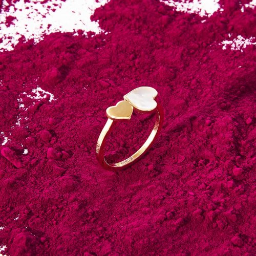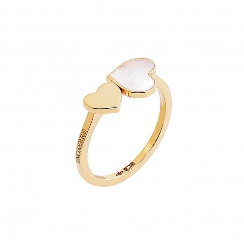 Anello in oro 9kt con cuore piccolo lucido e cuore grande con madreperla. Un gioiello finemente lavorato in cui due cuori si incontrano e si legano per un elegante omaggio all'amore. Un modello romantico reso unico grazie all'esclusiva madreperla che ne esalta la linea. Un dono speciale per celebrare chi ami.