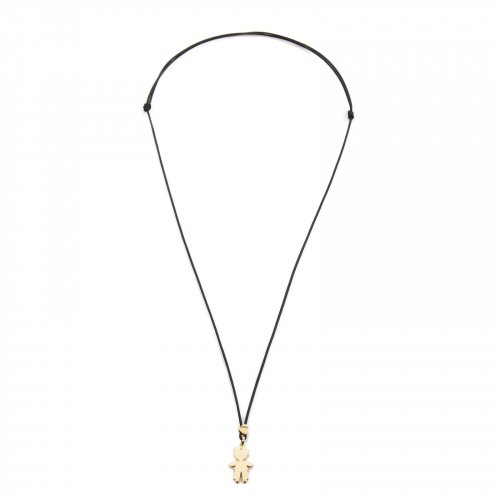 Pendente grande a forma di bimbo in oro 9kt e saliscendi a forma di cuore. La collana è costituita da un cordino nero in poliestere riciclato regolabile. La sagoma di bimbo, il cuore ed il cordino senza punti di apertura, simboleggiano l'amore per i figli e la famiglia, legami che non si rompono, non si piegano né si spezzano, indissolubili e senza confini.