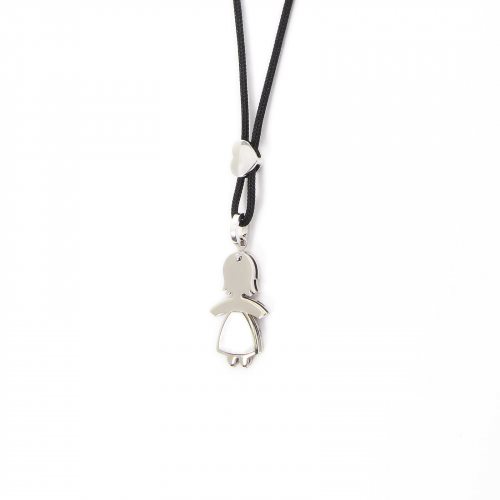 Pendente medio a forma di bimba in oro bianco 9kt e madreperla con saliscendi a forma di cuore. La collana è costituita da un cordino nero in poliestere riciclato regolabile. La sagoma di bimba, il cuore ed il cordino senza punti di apertura, simboleggiano l'amore per i figli e la famiglia che non si rompe, non si piega né si spezza, indissolubile, infinito.