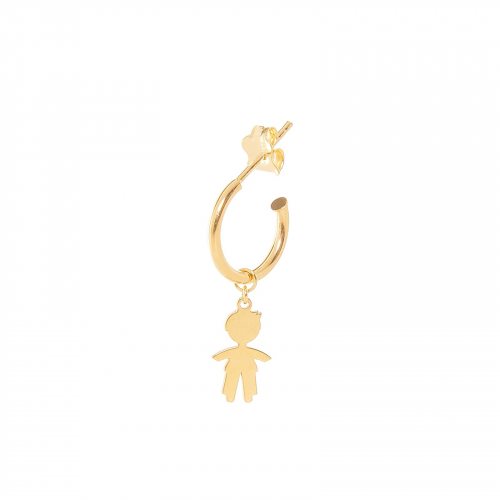 Mono orecchino a cerchietto in oro 9kt con mini-charm pendente a forma di bambino e chiusura con perno e farfallina. La brillantezza dell'oro e la fine lavorazione esaltano la linea semplice di questo orecchino, in cui la forma di bimbo, piccolo omaggio all'amore più vero e puro, è pensata per celebrare il calore e la gioia degli affetti, delle emozioni più vere.