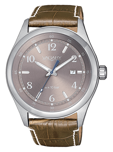 OROLOGIO VAGARY BY CITIZEN CASSA IN ACCIAIO CINTURINO IN PELLE MARRONE QUADRANTE GRIGIO DATA ORE TRE